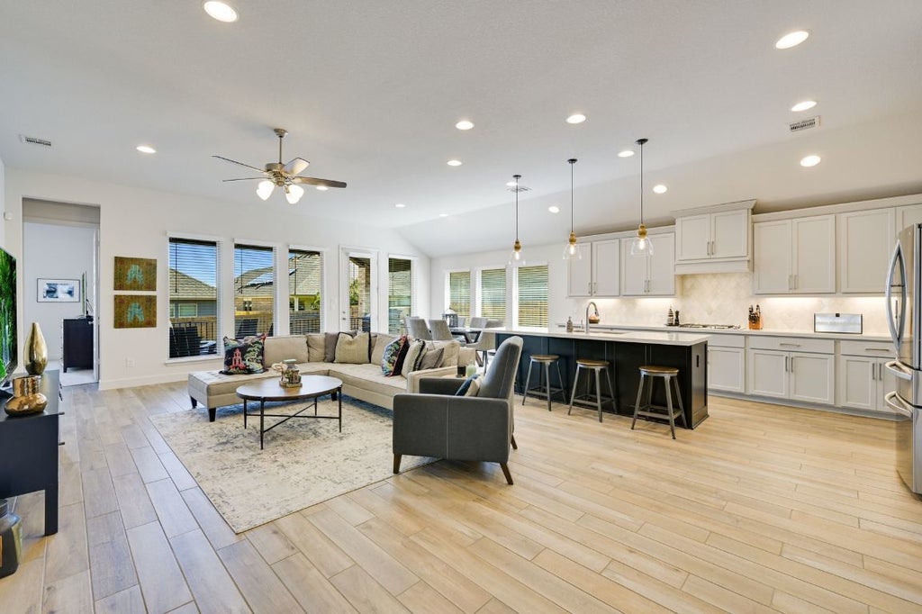 Impeccably designed single-story home in the highly desirable 6 Creeks community blends modern comfort with timeless style. A 12-foot entryway opens to an airy living area with a wall of windows and seamless flow into the kitchen, which features a large center island with seating for four, quartz countertops, a marble backsplash, stainless steel appliances, and a walk-in pantry. The private primary suite, set at the back of the home, offers dual walk-in closets, a soaking tub, and a spacious walk-in shower. In addition to a private guest suite with an en-suite bathroom, two additional guest rooms share a full bath, plus a room with French doors that is currently used as a gym, which is flexible enough to serve as a home office or second living area. Outdoor living is ideal with a large covered patio equipped with ceiling fans and a gas grill stub. A rare three-car tandem garage provides added storage and functionality. With wood-look tile flooring, high ceilings, and a neutral color palette throughout, this home offers a sophisticated, open feel. Residents enjoy community amenities including scenic trails, a pool, and parks, all just minutes from shopping, dining, and convenient I-35 access to Austin.